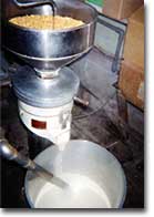 一晩水漬けされた大豆は、生豆の約2.3倍に膨れます。この時、大豆は発育成長しているのです。 この発芽寸前の大豆を使い、朝早くから豆腐をつくる。 地元の豆腐が美味しい訳はここにあります。